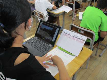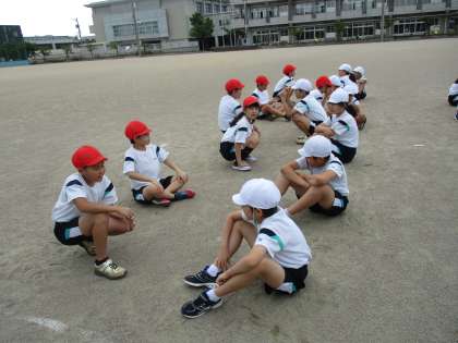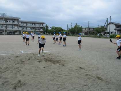 走り幅跳びの記録を伸ばすために、毎時間練習に励んでいます。自分の跳ぶ姿を動画に撮って、お手本の動画と見比べたり、友達に自分の頑張りたいことを伝えてフォームを確認してもらったりしています。いい記録が出るように頑張りましょう!