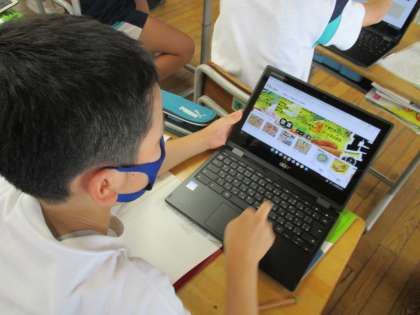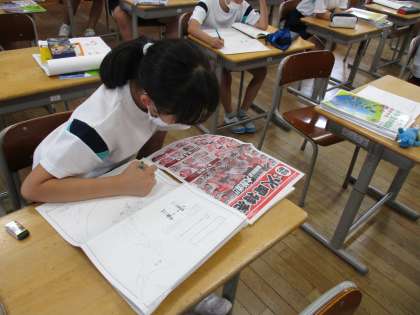 5年生の社会では、食料生産地についての学習をしています。家から持ってきたチラシや、インターネットのチラシを見て産地を調べました。見つけた産地を白地図にたくさん書き込むことができました。