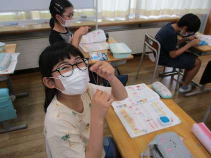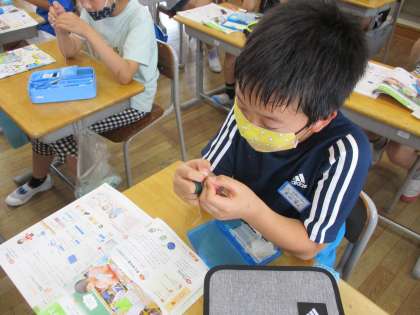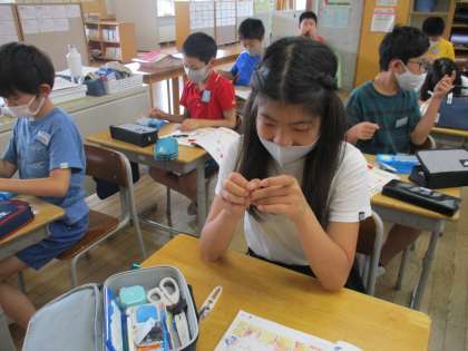 家庭科の学習で、裁縫を始めました。針に糸を通したり、玉結びをしたりする練習をしました。たくさん練習をして、裁縫をマスターしよう!