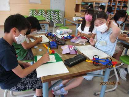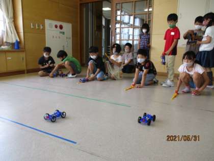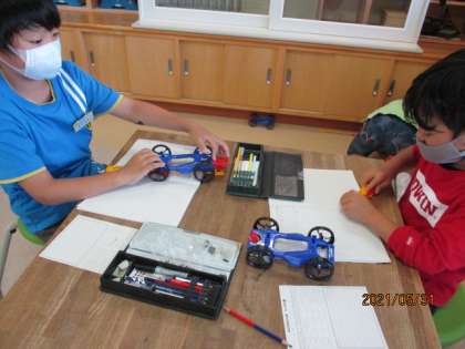 理科で「ゴムのはたらき」についての学習をしています。どうしたら車が遠くまで進むか、ゴムの性質を理解し、予想を立てながら学習に取り組む子供たちです。