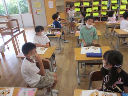 本日は、雨の中登校することになりましたが、見事に晴れ、お昼休みには外の遊具で遊ぶ1年生でした。写真は、水やりをする様子、国語「おおきなかぶ」の音読発表会をする様子、国語「すきなもの、なあに」ですきなものを班のみんなに発表している様子です。