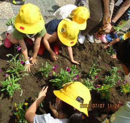 本日は、雨も止み、外で学習することができました。写真は生活科で梅雨の光陽の森や、ビオトープを観察する様子。1年生の教室前の花壇にお花を植えている様子です。