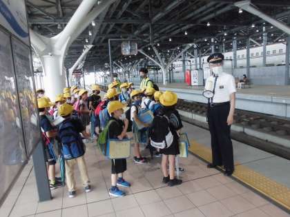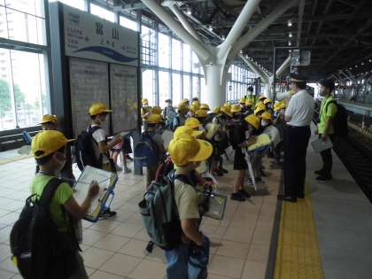富山駅に社会見学に行ったときの様子です。子供たちは、富山の交通網の中心である富山駅で駅員さんに案内してもらい、駅構内を散策しました。「一日に何本の電車が来るのか」「一日に何人が利用しているのか」など子供たちは真剣なまなざしでたくさん質問していました。