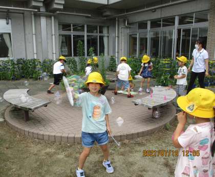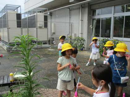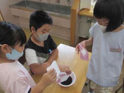 本日は生活科の時間に、あさがおの色水作りやシャボン玉遊びをしました。大事に育てたあさがお(しぼんだもの)を摘み、水に入れて色水を作りました。半紙にその色水をつけると、きれいな模様になりました。シャボン玉遊びでは、ストローで吹いたり、お家から持ってきたうちわを使ったりして、シャボン玉を作りました。