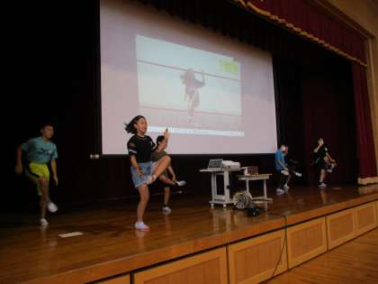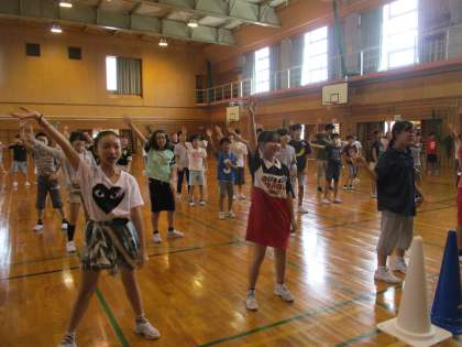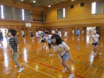 さんさんタイムに、体育館で「ハンドクラップ」ダンスを踊りました。10分間、身体を大きく動かして踊ったので、暑い体育館が熱気でさらに暑くなりました。
