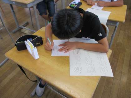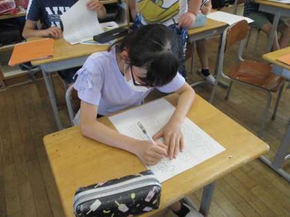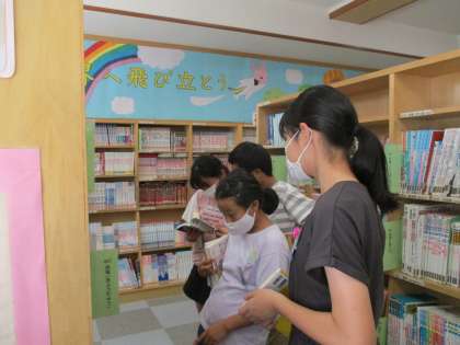 夏休みのしおりと生活表を配り、夏休みの生活について確認したり、夏休み中に読む本を借りたり、「防火ポスター」の文字の描き方を練習したりしました。
