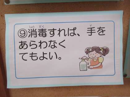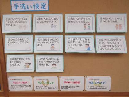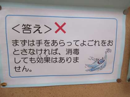 保健室前の掲示板「手洗い検定コーナー」を紹介します。これまでも、手洗いや手指の消毒については、十分に指導してきましたが、この掲示板を見て、2学期改めて「手洗いの大切さ」に対する意識を高めてほしいと考えています。