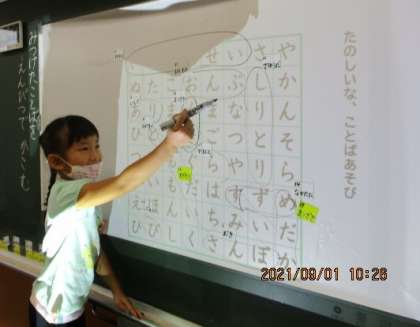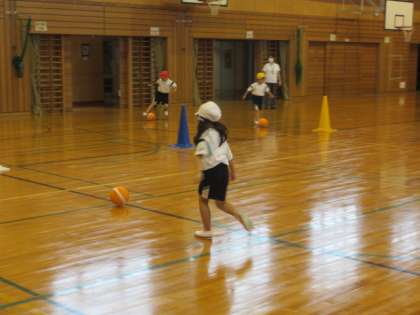 写真は、体育の「ボール蹴り運動」でドリブル練習をしている様子と、国語の「たのしいな、ことばあそび」で隠れた言葉を見つけている様子です。