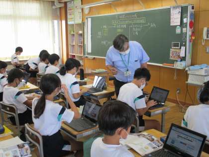 最近の学習の様子です。社会科の学習では、パソコンを使って調べ学習をしています。外国語科の学習では、ALTの先生と一緒に、リズムに合わせて単語を練習したり、友達と英語で質問し合ったりしています。