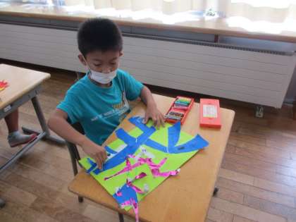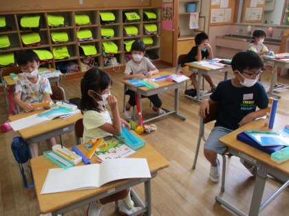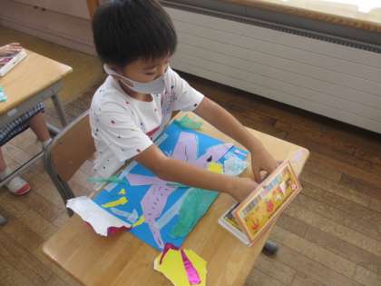 写真は、図工の「やぶいたかたちから」で作品を作っている様子、算数の「10よりおおきいかず」で友達に問題を出している様子です。