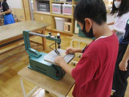 図画工作科では、電動糸のこぎりを使って作品をつくります。木の板を切って、伝言板にします。