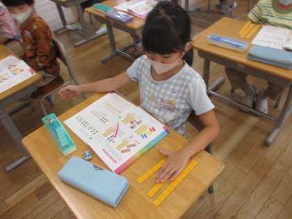 写真は、学習発表会の歌の練習をしている様子と、算数の数え棒を使っている様子です。