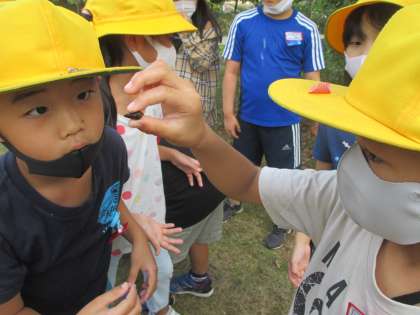生活科「いきものとなかよし」の学習では、学校のなかよし広場にいる生きものを見付けようと、夢中になって探していました。