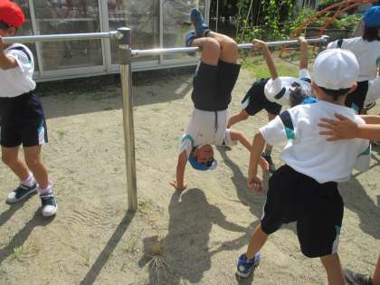 体育科では、今、みんあ鉄棒に夢中です。できる技が増えてきました。鉄棒にぶら下がりながら、友達とじゃんけんもできるようになりました。