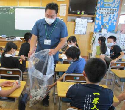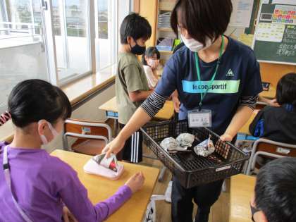 第1回目の授業では、一日一人あたりおにぎり1個分の食品ロスがあるという現状を知り、おにぎり(新聞を丸めた物)を使って体感しました。袋いっぱいになったおにぎりを見て、「もったいない」「まだ食べられるのに」とつぶやく子供たちでした。