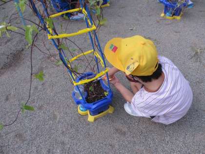 アサガオのツルは成熟し、茶色になってきています。そのツルを鉢や支柱からとり、リースにする準備をしています。一生懸命育てた愛着のあるアサガオに「ありがとう」と伝えながら切っていきました。