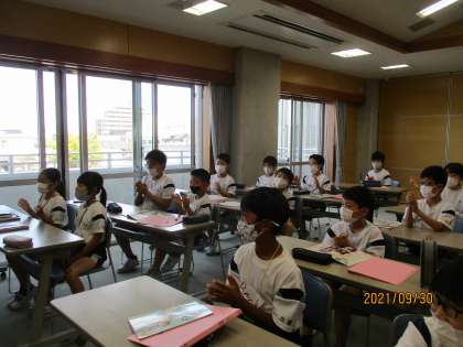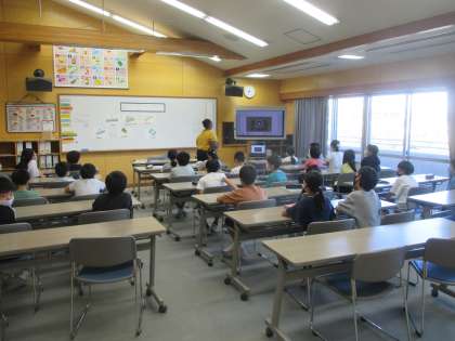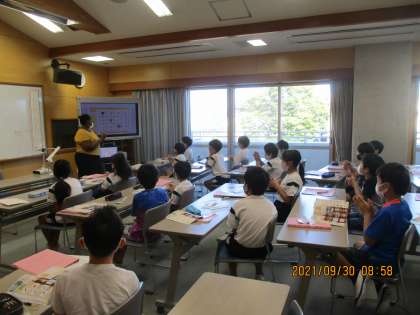 ALTのタミーカ先生との外国語活動。今日は文房具の言い方について学習しました。リズムに合わせて発音したり、手を叩きながらテンポよく発音したりして何度も練習しました。「最初は難しかったけれど、もう結構言えるようになったよ」と嬉しそうに話していました。