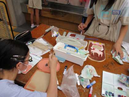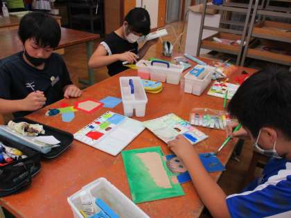 電動糸のこぎりで板を切ったあと、絵の具で色を付けました。もう少しで完成です!