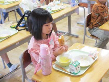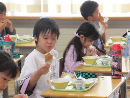 本日は、2学期に入って2度目の投票によって決定した「光陽ゆめランチ」です。今日は、きなこの揚げパンが出ました。子供たちは、食べる前からウキウキする子供たちでした。「はじめて食べる!」「おいしい〜」と口にきなこを付け、満面の笑みを浮かべて食べていました。