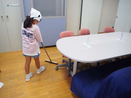 隅々まで丁寧にゴミをほおきやぞうきんで掃除をしています。