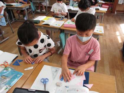 三角定規の角を使って、身の回りにある「直角」を見付ける活動をしました。ノートやネームプレートの角が直角になっていることに気付たり、折り紙を切ってできた形の直角を調べたり、意欲的に学習に取り組みました。