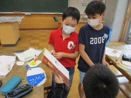 電動糸のこぎりで作った掲示板が完成しました。できあがったホワイトボードに、早速文字や絵をかいて楽しんでいました。