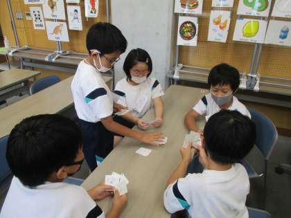 今日の外国語活動では、文房具の絵カードを使ってゲームをしました。「Do you have〜?」と友達に質問したり、「I have〜」と自分の持っている文房具を伝えたりしました。トランプのババ抜きのようなゲームで、とても盛り上がりました。