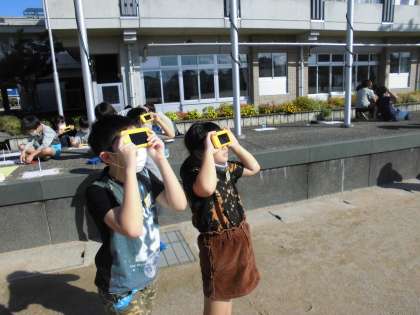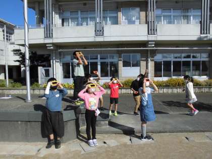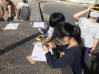 今日は久しぶりに天気もよく、外に出て「かげの向きが時間によって変わるのはどうしてだろう?」という疑問のもとに太陽とかげの観察を行いました。遮光プレートを使って太陽を見たり、かげの動きを記録したりして普段何気なく感じているかげについて深く考える子供たちでした。