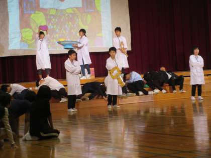 6年生は、劇「大人会議」を発表しました。思春期に感じやすい大人への反発や、大人も子供ももっている怒りの感情について真っ正面から取り上げ、それぞれの役どころを体当たりで演技しました。「怒り」の感情はただ取り去ればよいというものではなく、「怒り」の感情の裏には、大人から子供への深い愛情があることに気付きます。劇の中で、大人も子供も変容していく意味深い内容でした。難しいテーマに挑戦した6年生。最後の歌には、12才の今の思いをこめて、美しく歌い上げました。