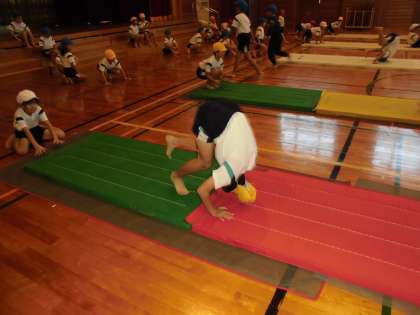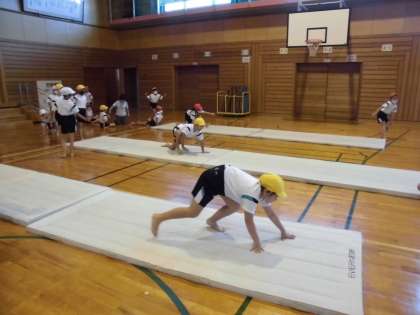 今週から体育はマット運動をします。今日が一番最初のマット運動の日でした。子供たちは動物歩きをしたり、前回りをしたり、たくさんの動きをしながらマット運動を楽しみました。