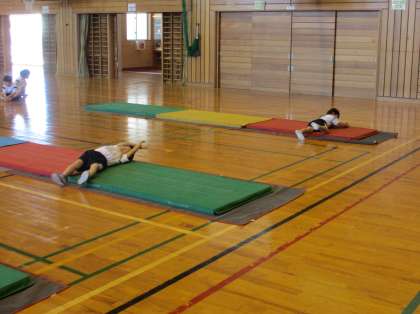 本日は、久しぶりに体育をしました。1組は、体育館でマット運動をし、2、3組はグラウンドでボール蹴り運動のゲームをしました。学習発表会の練習を毎日行っていたため、久しぶりの体育でしたが、仲間と声をかけ合いながら楽しそうに身体を動かす1年生でした。