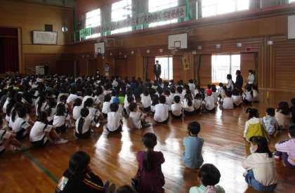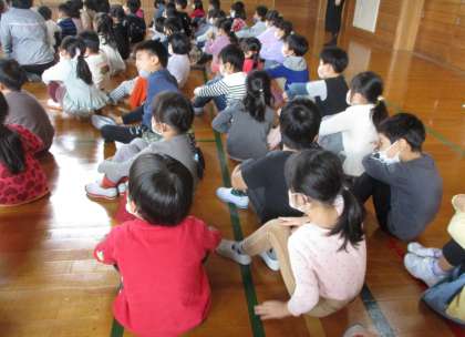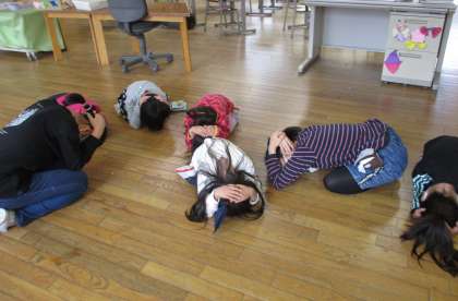 今日は、入学してから初めてのシェイクアウト(地震)訓練です。低く、頭を隠し、動かないの約束を守っていました。また、今日は休み時間中の避難訓練ですので、子供たちはそれぞれの場所から、自分たちで体育館まで避難しました。高学年のお兄さんお姉さんの先導のもと、落ちついて移動することができましたね。