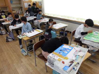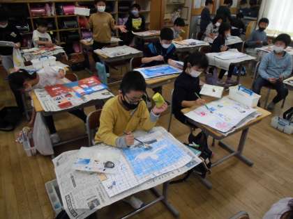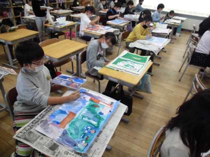 図工の学習で、絵を描いています。「あの日、あの時の気持ち」という単元で、子供たちは自分の思い出に残っていることを絵に表しています。この絵は最後、自分の写真を貼り付けて完成します。だんだんと完成が近づいてきており、とても楽しみです。