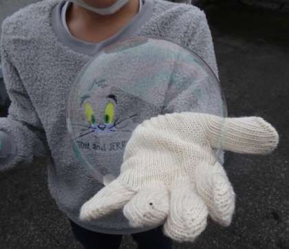 子供たちも、モールを持ってきたり、軍手を持ってきたりと、やる気満々!今回は、湯冷ましの水を使い、最後に魔法の液「グリセリン」を数滴。それだけのことなのに、大きなシャボン玉ができるようになり、手の上で弾ませることができるようになりました。