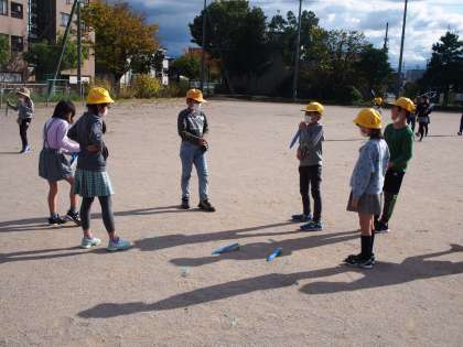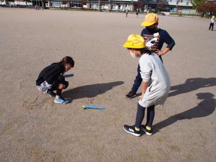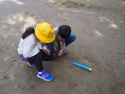子供たちは、日なたと日陰の気温が違うのではないかと予想し、温度計で測って調べました。