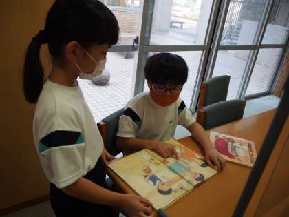 1年生に読み聞かせをするために、グループごとに分かれ、どんな本がよいか考えました。絵が多い本や興味をもてそうな本がよいと考え、一生懸命探していました。