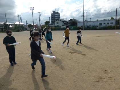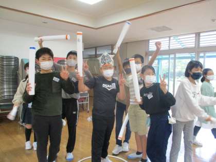 社会科の学習で「天下統一ゲーム」を行いました。5つの軍に分かれ、大将を決めます。大将の腰についている紙風船を最後まで守ることができた軍が、天下統一です。