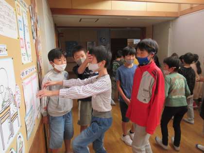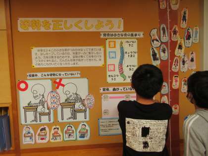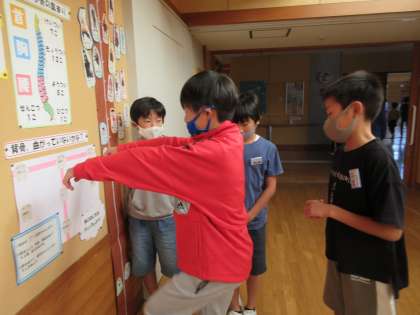 保健室前によい姿勢を目指して、「体のねじれ」をチェックするコーナーができました。目を閉じて、両手を挙げて、50回足踏みをしても、足型の上に立っていれば、背骨は曲がっていません。「ぼくは、どうかな?「次、ぼくもやってみよっと!」トン、トン、トン、トン・・・保健室前に足音が響きます。これから寒い季節になりますが、背骨をまっすぐによい姿勢でいましょう。