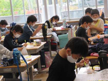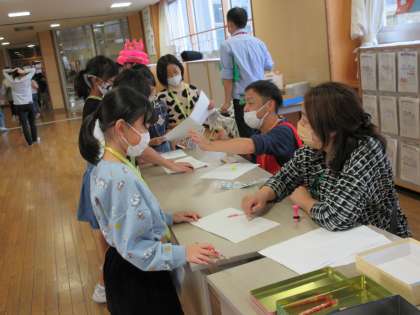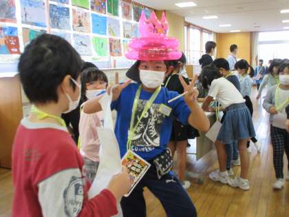 3年生も楽しい時間を過ごしています。教室へ行ってみると、「あれ?授業?」と思うほど真剣にがんばっている姿がありました。それは、「間違い探しクイズ」に取り組んでいるところでした。すばらしい集中力!PTA役員の方に答え合わせをしていただき、嬉しそう。景品を身に付け、嬉しさ全開な人もいましたよ!