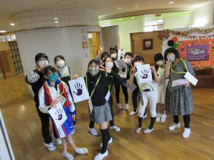 互いの手型を見合いながら、談笑中の5年生。手型の下には、将来の夢を書きます。「みんないきいき輝いて 夢と希望にまっしぐら」でありますように!