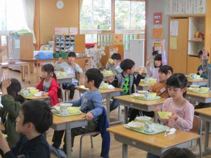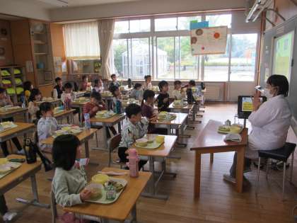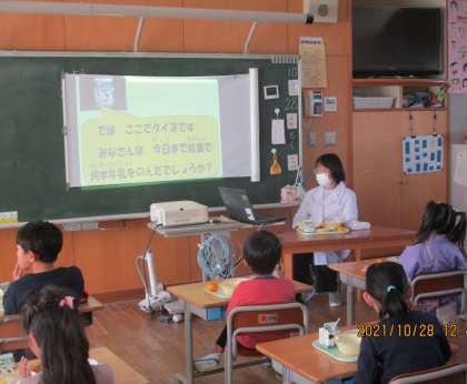 横井栄養職員から、給食の時間に牛乳のすごい秘密についてのお話を聞きました。子供たちは黙食をしながらクイズに答えたり、お話を聞いたりしていました。6年生は小学校にいる間だけで、1000本以上の牛乳を飲んできたと聞いて、びっくり!!!!優しい6年生の秘密は牛乳にあるようですね。