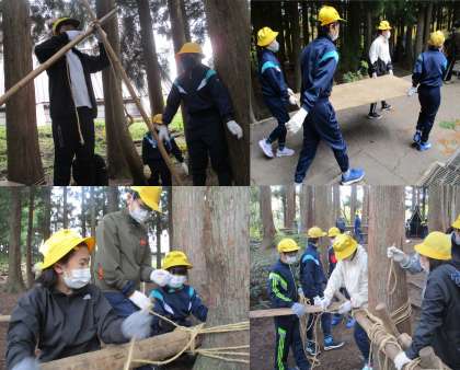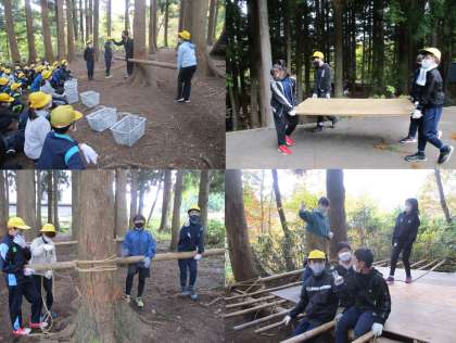 いつもより早めの登校でしたが、元気に「行ってきます!」と言ってから学校を出発!バスに揺られること1時間。入所式をし、いよいよ森小屋作りスタートです♪