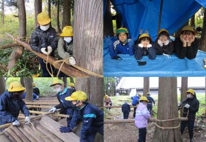 森小屋作りでは、どの班も、とてもダイナミックな森小屋ができました。「ここを持って!」「僕も一緒に運ぶよ!」と力を合わせて作業をしたり、「階段作ろうよ!」「ブランコも作りたいな!」とアイディアを出し合ったりし、夢中になって森小屋作りを楽しみました。