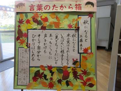 11月の「言葉のたから箱」に、工藤直子さんの「秋になると」を選びました。校庭の木々も、街路樹も、今は紅葉が美しく、心まで温かくなります。実も熟し、いろいろな食べ物もおいしい季節になりました。その様子が、光陽っ子とそっくりです。様々な体験活動を通して学んだ満足感からか、どの子もとても「いい顔」をしています。