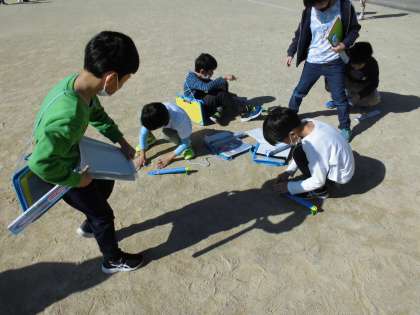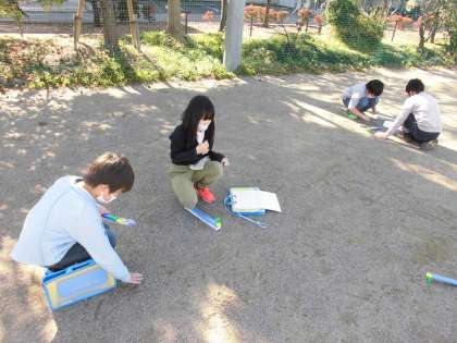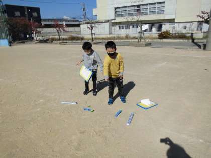 今日は久しぶりに天気がよく、外に出て日なたと日かげの地面の温度をはかって比べました。日なたと日かげでは10度くらいの違いがあって、子供たちも驚いている様子でした。