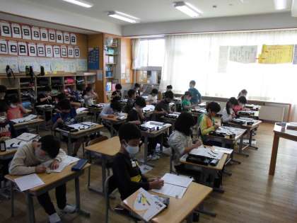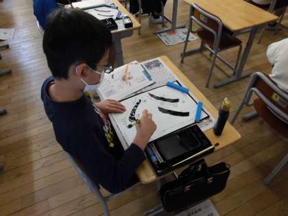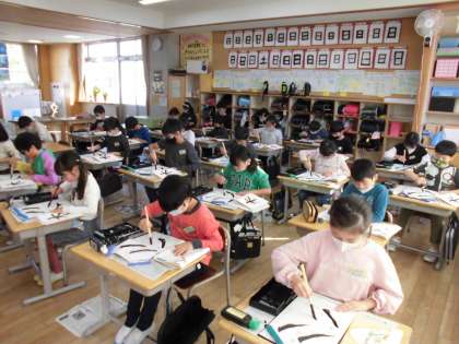 書写で「木」の練習をしました。「木」には「右はらい」と「左はらい」があり、丁寧にゆっくりと心を込めて書いていました。
