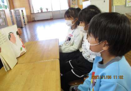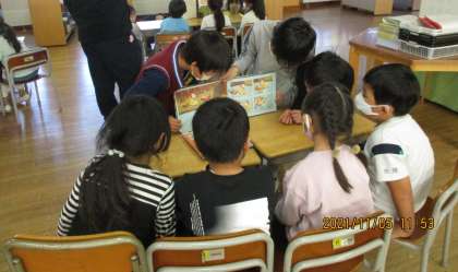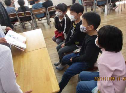 3年生は国語科の学習で、「1年生が本を好きになるため」の絵本を選ぶ学習をしています。今日は、3年生さんにその絵本を読み聞かせしてもらいました。班に分かれて読み聞かせを聞きました。初めて見る絵本はもちろんのこと、知っている絵本でも読み聞かせをしてもらうと特別感があり、食いつくように聞いていました。