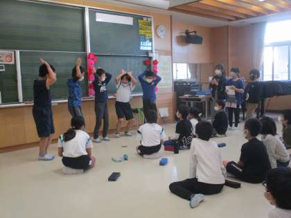 3組では集会が行われ、色団対抗でジェスチャーゲームをしました。簡単なお題でもポーズを考えるのは意外と難しかったようです。とても楽しい集会でした。