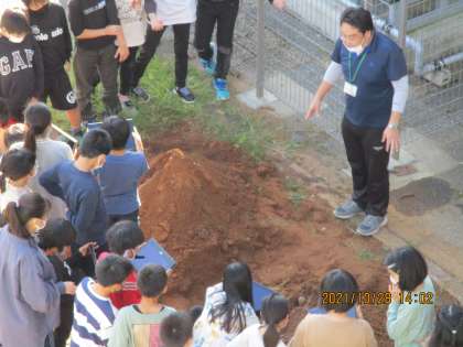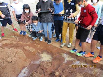 理科の学習では、流れる水のはたらきについて学習しています。実際に外で土の山に水を流し、川の様子を観察しました。