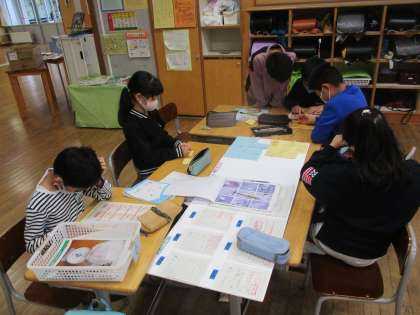総合的な学習の時間では、グループに分かれて活動を進めています。落ちていたごみの種類を調べたり、地図上に表したりとそれぞれ工夫しています。